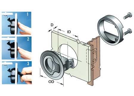 Chiusura a spinta per portelli e paglioli con montaggio ad incasso.