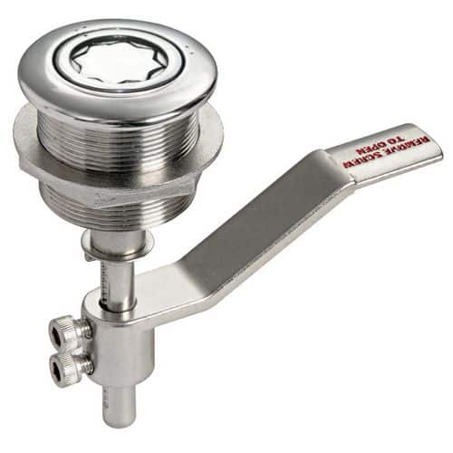 Alzapagliolo completamente in acciaio inox Aisi 316 con rotazione a 90°, quando non in uso rimane completamente a filo grazie ad un sistema a molla che chiude il foro a stella.