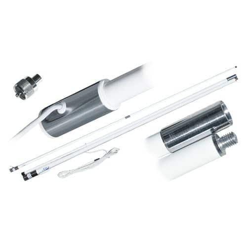 Antenna VHF in fibra con impugnatura in ACCIAIO INOX AISI 316, fornita con 5 metri di cavo coassiale e connettore; divisibile in due pezzi da 1,20 m cadauno per facilitare il trasporto ed il rimessaggio.