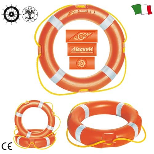 Salvagente anulare “MAGNUM” omologato R.I.Na., costruito in polietilene HD alta densità con interno in poliuretano a cellule chiuse. Dotato di fasce riflettenti e sagola. Studiato appositamente per ottenere la massima compattezza, leggerezza e resistenza agli agenti atmosferici.