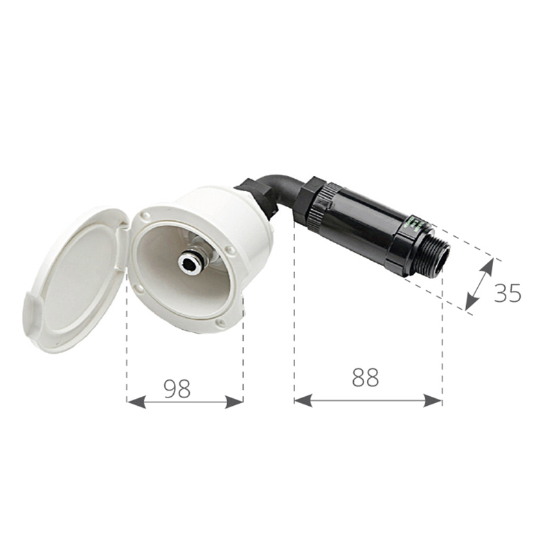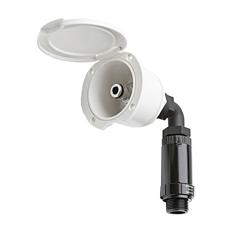 Box contenitore con innesto rapido e riduttore di pressione per carico acqua dolce tramite collegamento alla rete idrica della banchina. Completo di contenitore e coperchio in ASA bianco, riduttore di pressione 2,5 bar, curva a gomito con filetto maschio da 3/4” e valvola di non ritorno.