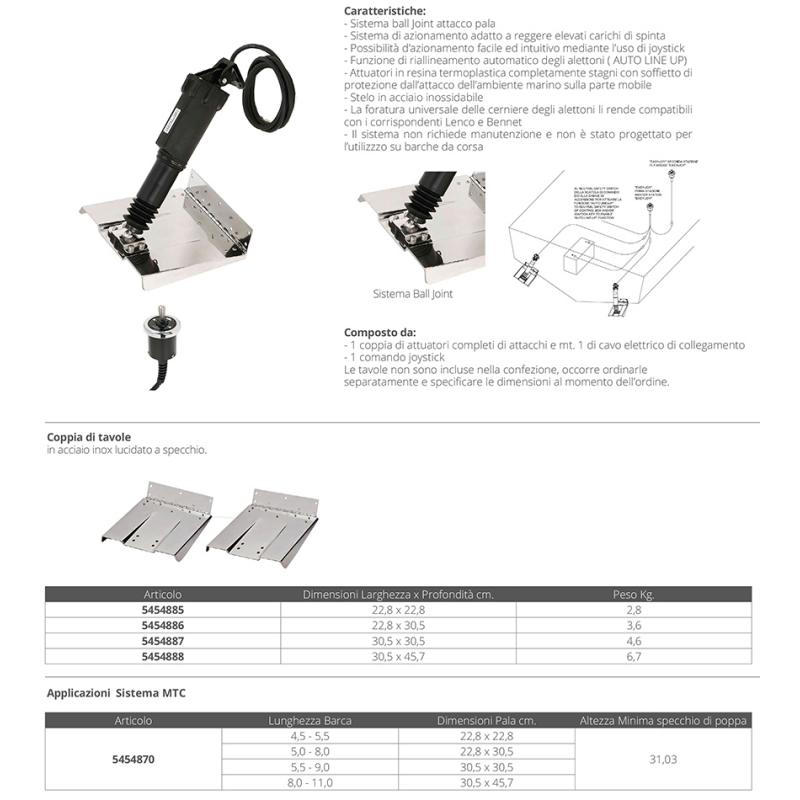 L’uso dei correttori di assetto elettromeccanici permette all’imbarcazione di mantenere costantemente un assetto adeguato alle varie condizioni di navigazione, consentendo un maggior rendimento del motore ed un sensibile risparmio di carburante. Pale non incluse nella confezioneCaratteristiche:- Sistema ball Joint attacco pala- Sistema di azionamento adatto a reggere elevati carichi di spinta- Possibilità d’azionamento facile ed intuitivo mediante l’uso di joystick- Funzione di riallineamento automatico degli alettoni ( AUTO LINE UP)- Attuatori in resina termoplastica completamente stagni con soffietto diprotezione dall’attacco dell’ambiente marino sulla parte mobile- Stelo in acciaio inossidabile- La foratura universale delle cerniere degli alettoni li rende compatibilicon i corrispondenti Lenco e Bennet- Il sistema non richiede manutenzione e non è stato progettato perl’utilizzzo su barche da corsa