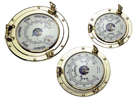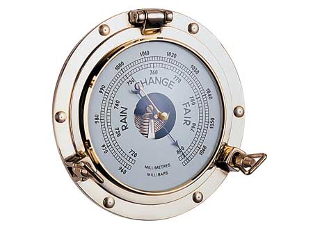 Barometro oppure orologio su oblò in ottone lucido.
