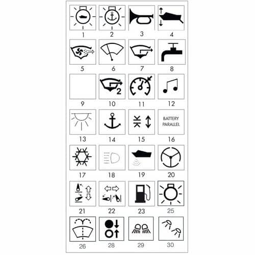 | Variante | Luci di via, Luce di fonda, Flap, Aspiratore, Tergivetro, Pompa sentina, Autoclave, Neutro senza simboli, Pompa sentina " 2" , Luci quadro, Stereo, Luci pozzetto luci cabina, Comando verricelli ancora, Aperture portellone, Faro di profondità, Ecoscandaglio, Pilota automatico, Passerella alzo/abbasso, Passerella allungamento, Pompa benzina o elettrovalvol |