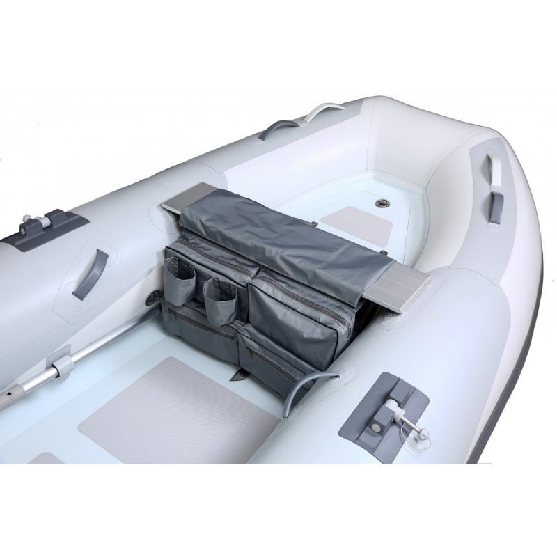 Borsa Multi-tasca in PVC grigio per tender e piccole imbarcazioni muniti di seduta fissa o rimovibile, facile da sistemare e rimuovere grazie al velcro di fissaggio, dotata di cuscino in schiuma di altezza mm.25 per un migliore comfort, nr. 4 ampie tasche con zip di dim. cm. 33x33x10, nr. 4 piccole tasche con zip di dim. cm. 33x18x5 e nr. 4 tasche porta tazze o portabottiglie. Dimensioni massime seduta su cui poter essere applicata larghezza cm.20 spessore cm.2.