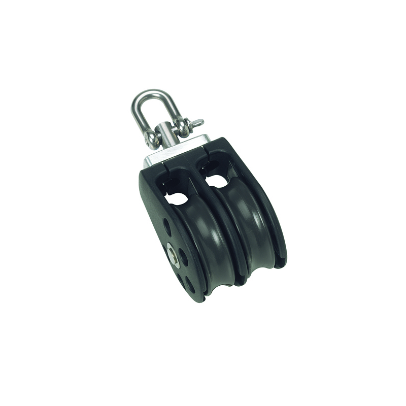 SERIE 1 – Bozzello doppio con occhio girevole, Ø cima max mm. 8, max carico di lavoro kg. 355 carico di rottura kg. 710, dimensioni puleggia mm.30 x 12, lunghezza mm. 73
