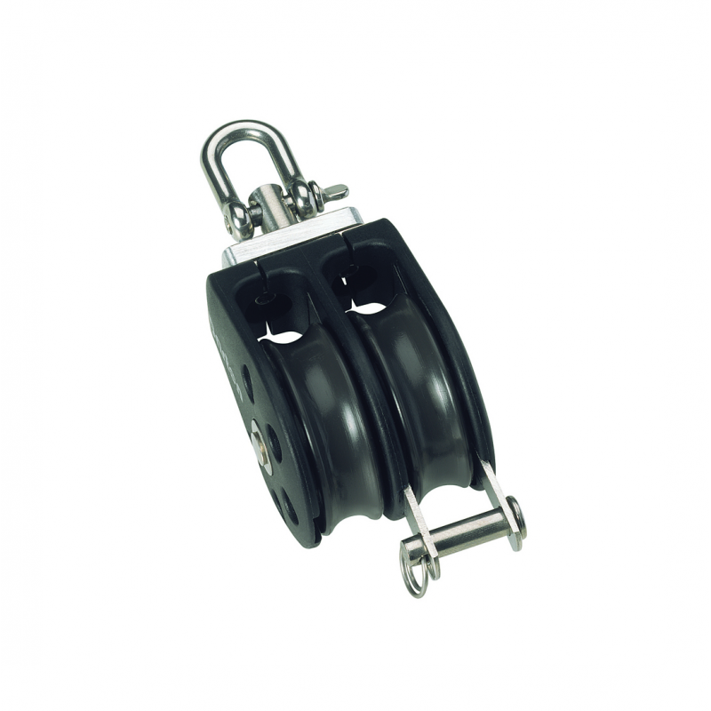 SERIE 1 – Bozzello doppio con occhio girevole e arricavo, Ø cima max mm. 8, max carico di lavoro kg. 355 carico di rottura kg. 710, dimensioni puleggia mm.30 x 12, lunghezza mm. 84