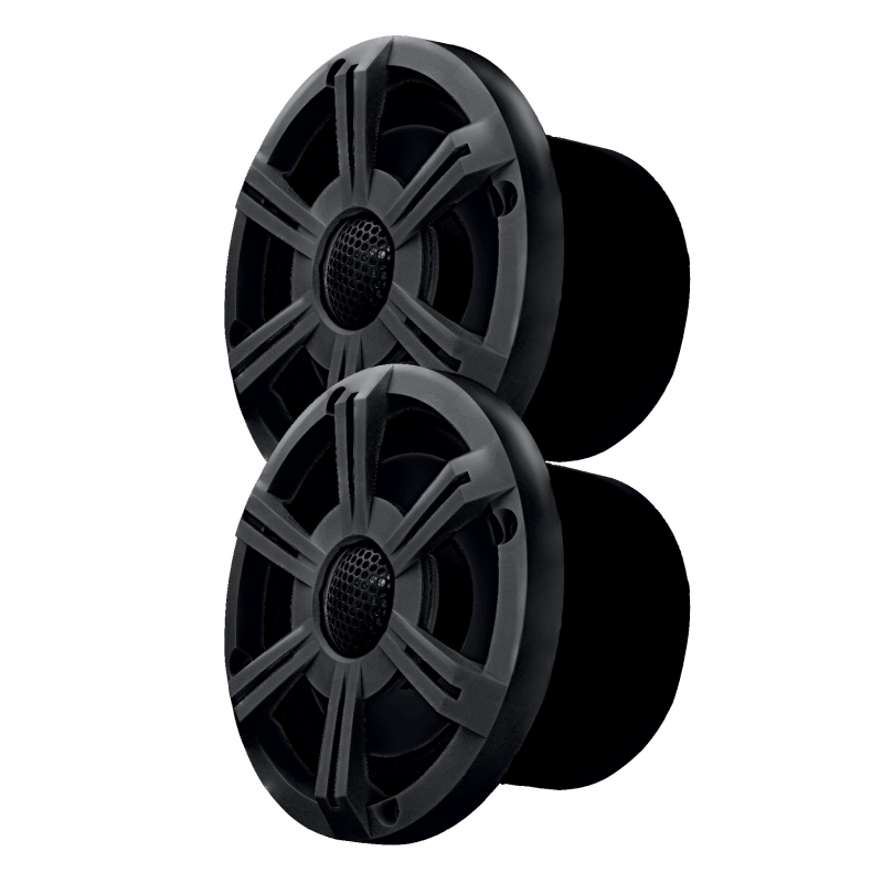 Coppia altoparlanti Bluetooth plastica nera anti UV, collegabili allo smartphone. Portata del Bluetooth mt 8 e impedenza Ohm 4.
