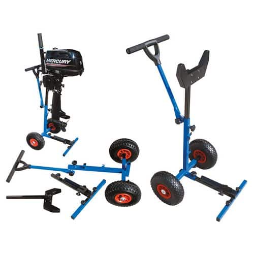 Cavalletto porta motore pieghevole in acciaio vernicitao di blu con ruote pneumatiche in gomma.