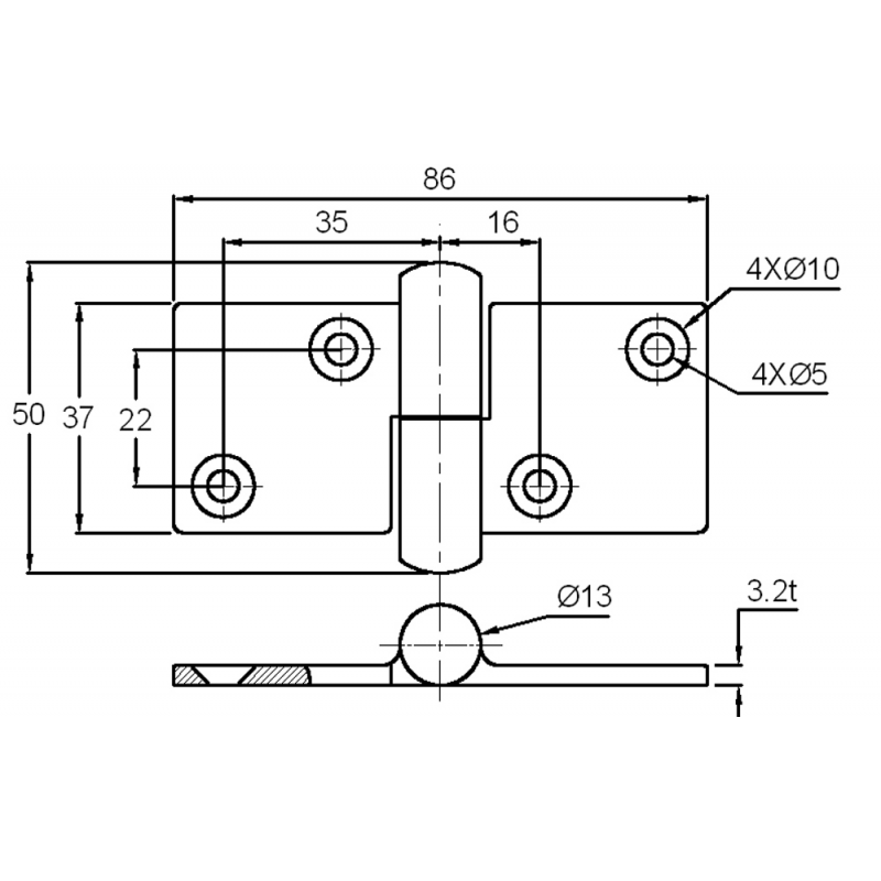 Cerniera lucidata a specchio in acciaio inox AISI 316. Sfilabile per porte e cofani motore. Spessoremm. 3, mm. 86 x 50 sfilabile destra