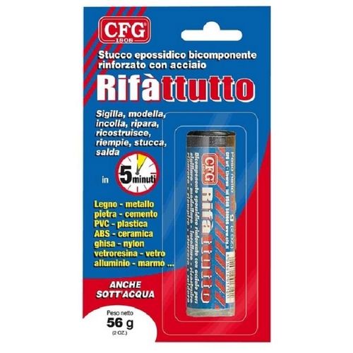 Bicomponente epossidico rinforzato con acciaio per: sigillare, modellare, incollare, ricostruire, riparare , riempire, stuccare, saldare anche sott’acqua in pochi minuti legno, pietra, metallo, cemento, PVC, plastica, ABS, ceramica, vetro, ghisa, vetroresina, alluminio, marmo, nylon…. Peso netto 56 g (2 OZ.). Stucco epossidico bicomponente rinforzato con metallo. Semplicissimo da usare grazie al predosaggio dei componenti. Modellabile. Indurisce in pochi minuti. Ad indurimento avvenuto rifàttutto può essere forato, carteggiato, limato, smerigliato, segato, sabbiato, piallato, pitturato. Confezione 56 gr.