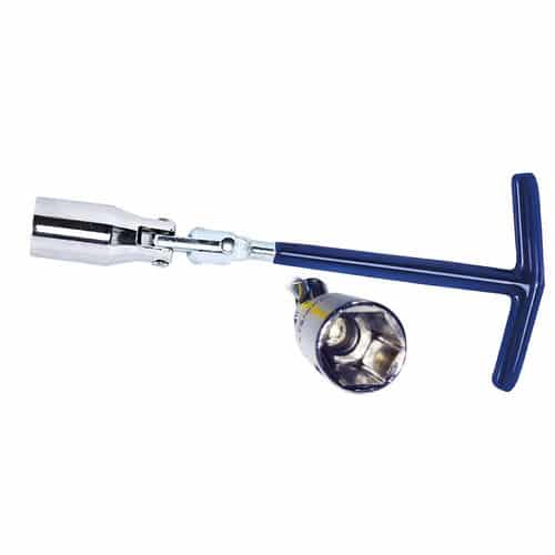 Chiave per candela a doppio snodo per utilizzo in ogni condizione con boccola esagonale ed impugnatura rivestita in materiale plastico.