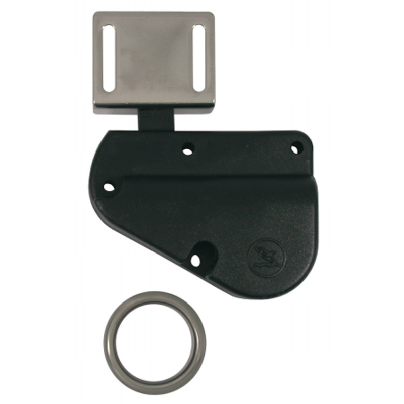 Chiusura in plastica e riscontro in acciaio inox, funzionamento con calamita per cassetti e ante mobili, apertura tramite la boccola in acciaio inox.