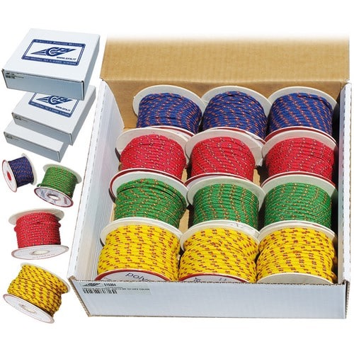Treccia colorata confezionata in piccole bobine; ideale per surf ed usi nautici grazie al suo basso assorbimento d’acqua. Colori assortiti con varie combinazioni di segnalino.