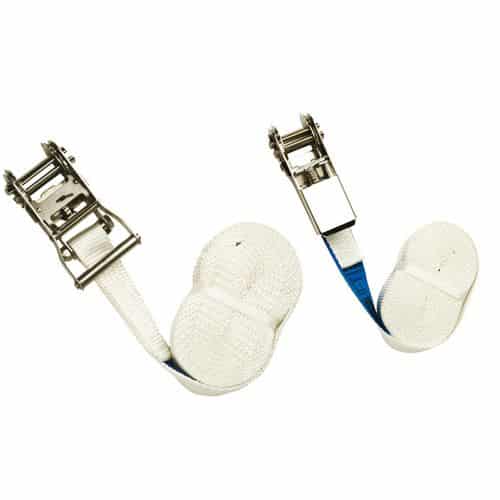 Cinghia in multifibra di poliestere ad alta tenacità con cricchetto in acciaio inox aisi 316 resistente alla salsedine. Conforme alla normativa EN 12195-2.