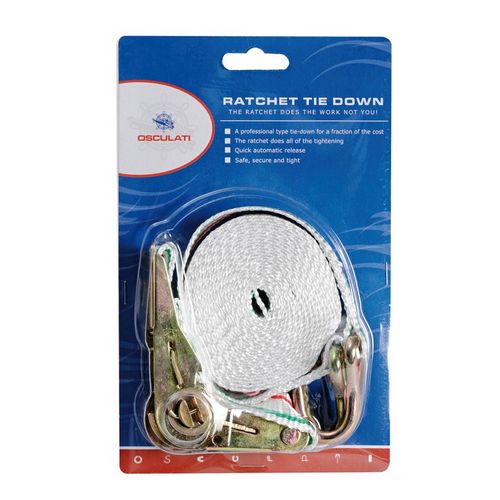 Cinghia resistente ai raggi UV provvista di ganci terminali in acciaio zincato e cricchetto intermedio, sempre in acciaio zincato e verniciato, per tendere a piacere il nastro. Adatta per fissare gli scafi sul tetto dell’auto o sui carrelli tramite gli anelli di prua o di poppa.