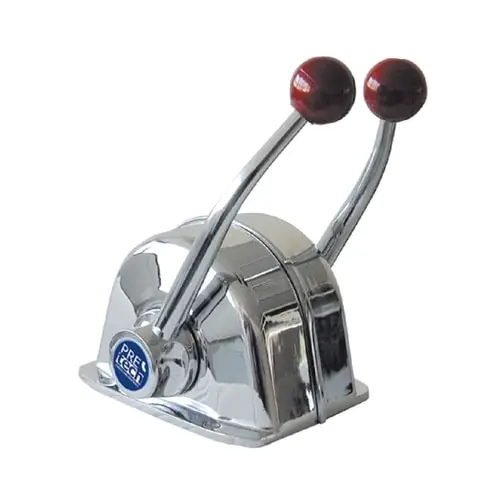 Comando bileva PRETECH per due motori a doppia azione, per il controllo di gas e marce su motori entrobordo ed entro/fuoribordo con leva e corpo in lega inossidabile cromata.