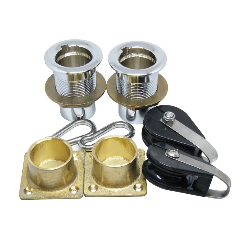 Gruette in acciaio inox. Complete di: carrucole, bozzelli, moschettoni, cimeper il richiamo, boccole da incasso che rendono le gruette girevoli edasportabili. La parte da inserire sotto coperta é lunga cm. 150 perchépossa essere tagliata alla misura desiderata. Sbraccio mm. 880, Ø tubo mm. 40, Ø foro mm 50, altezza mm. 1900, portata kg. 120.