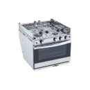 Cucina a 3 fuochi in acciaio inox con porta in vetro temperato, forno (capacità 19 L, portata 1500W) dotato di grill (portata 1350W). Dotata di termocoppia di sicurezza, para fiamma laterali, bruciatori in ghisa, ferma pentole antirollio, bloccaggio sportello forno e supporto cardanico (basculante). Parte posteriore smussata per facilitare l’installazione laterale. Accensione elettrica. Utilizzare con gas propano/butano, pressione di connessione 30 mbar. Ugello di collegamento cucina / impianto a gas da acquistare a parte.