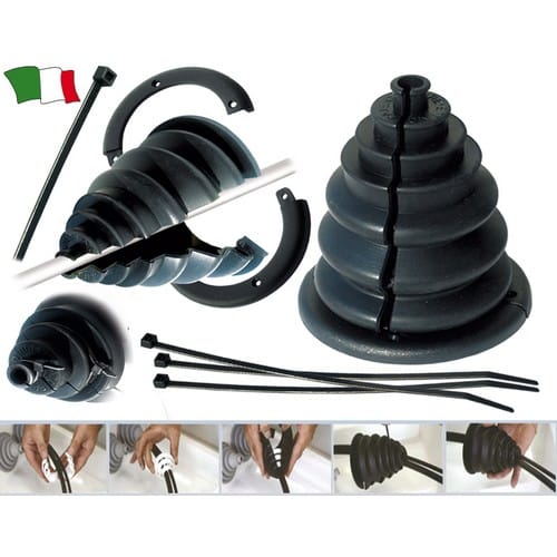 Cuffia passacavi in PVC che permette una facile sostituzione di un passacavo rotto, senza dover staccare i cavi motore. Le fascette sono applicate su apposite scanalature stringendo il soffietto sul supporto rigido interno, mantenendo la sua forma naturale.