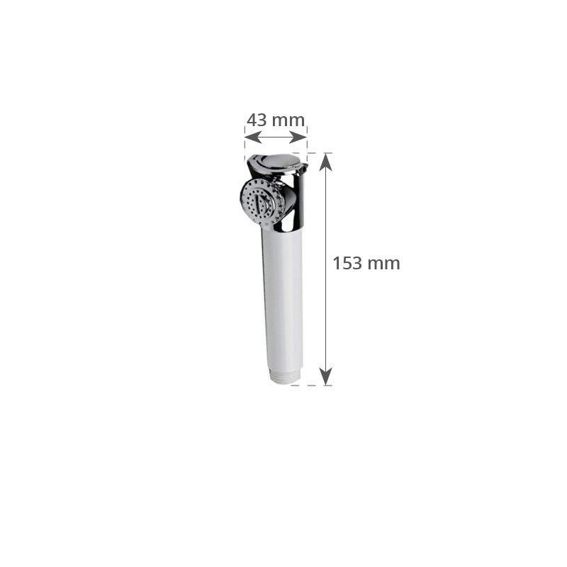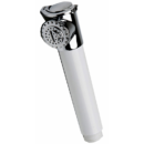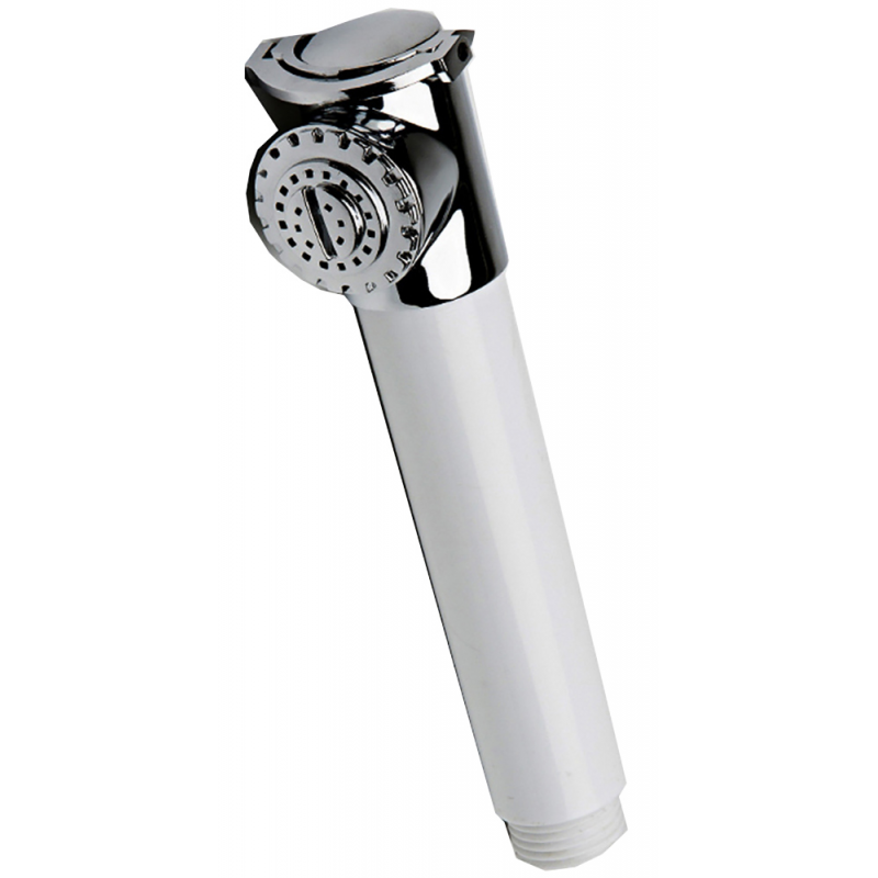 Doccia con testa in ottone cromato e impugnatura in ABS bianco, con pulsante push-off. Attacco 1/2”maschio. Per tubo art. 2424212/4 o similari.