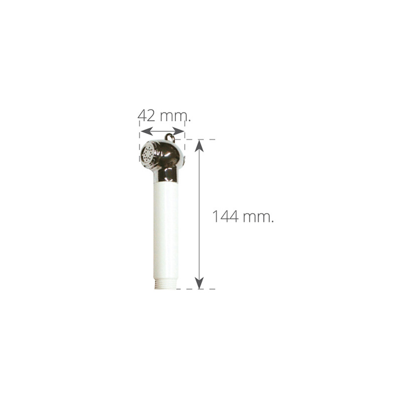 Doccia con testa in ottone cromato e impugnatura in ABS bianco, con pulsante push-off con ritorno automatico. Attacco 1/2” maschio. Per tubo art. 2424212/4 o similari.