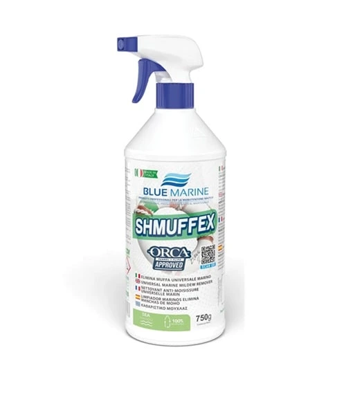 Detergente SHMUFFEX elimina macchie di muffa su superfici in vrt, gomma e cuscinerie,non adatto all’uso su stoffa, essendo a base di ipoclorito di sodio. Prodotto professionale per la manutenzione della barca e interno camper.