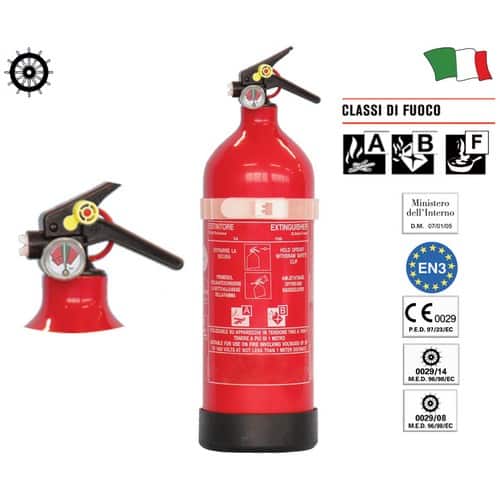 Estintore con manometro per uso nautico, a SCHIUMA A.F.F.F., CONFORME alla nuova DIRETTIVA M.E.D. 96/98 EC 0497/09 ed alla Normativa Europea EN3/1994 CE 1370 P.E.D. 97/23 EC.