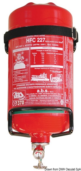 Estintore omologati RINA 6 kg, CE automatici a gas estinguente ecologico. Questo prodotto sostituisce l’Halon 1301 ed agisce a saturazione di ambiente. Rispetto alla polvere estinguente, non lascia alcun residuo per cui, anche in caso di apertura accidentale, non occorre ripristinare tutta la meccanica e accessoristica intasata dalla polvere estinguente. Il kit é composto da: bombola caricata a gas HFC-227 o FK-5-1-12 (ex NOVEC) + valvola speciale SPRINTVALVE ad attivazione termica a 93°+ cavetto con maniglia per comando a distanza, lunghezza 6 m accorciabile + staffa fissaggio estintore. Agendo per saturazione questo impianto non richiede tubazioni e ugelli supplementari.