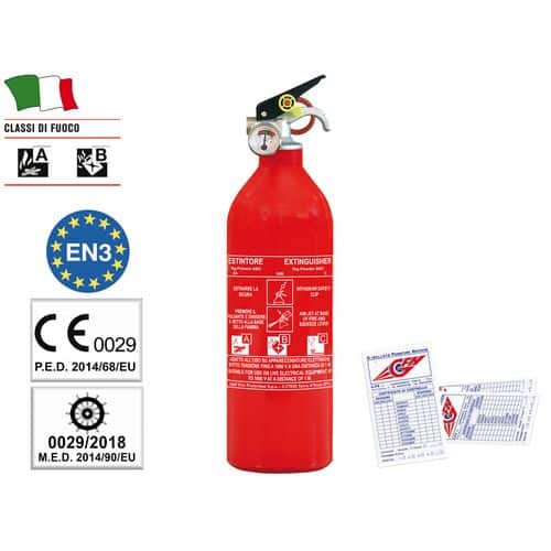 Nuova serie di estintori con manometro per uso nautico, PRESSURIZZATI A POLVERE, CONFORMI alla nuova DIRETTIVA M.E.D. 96/98 EC 0497/09 ed alla Normativa Europea EN3/1994 CE 1370 P.E.D. 97/23 EC.