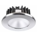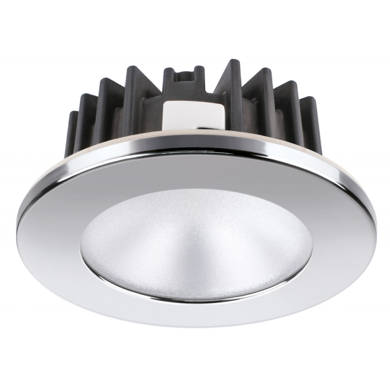Faretto stagno IP 66 a 2 POWER LED ( 245 Lumen ) ad altissima luminosità, luce bianca calda con cornice circolare in acciaio inox AISI 316 lucido.Sensibile alla polarità. Fissaggio con viti (non incluse)