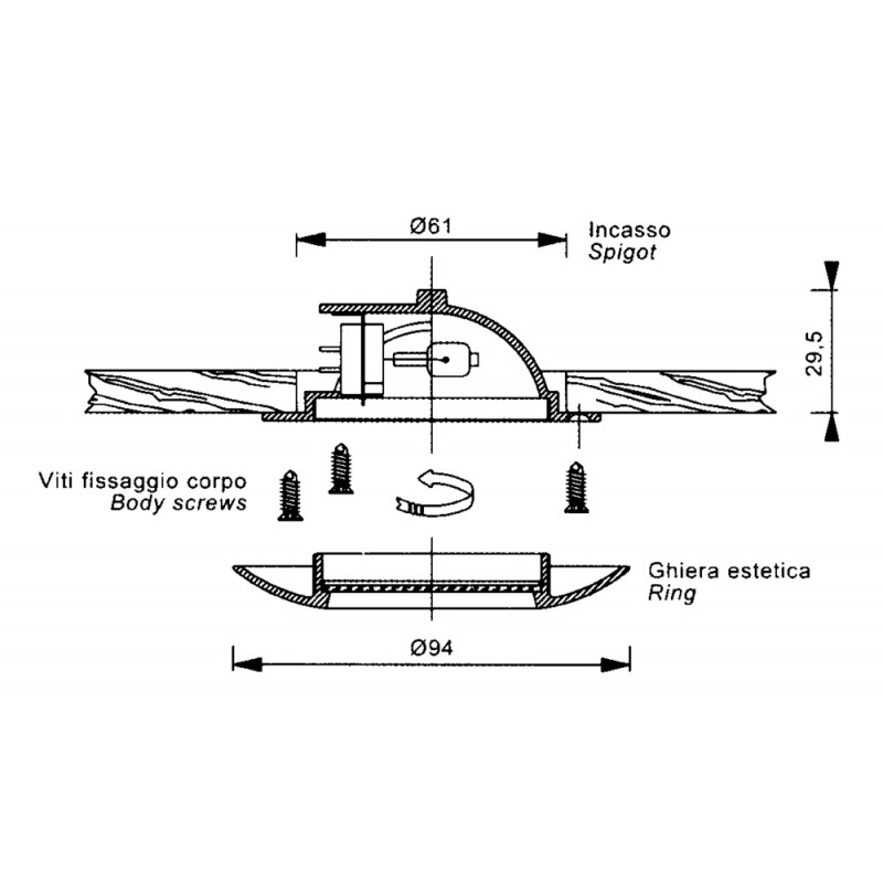 Faretti ad incasso in ottone pressofuso, con vetro temperato e satinato. . 3 fori di fissaggio. Lampadina (non compresa) per innesto G4 art: 4090318