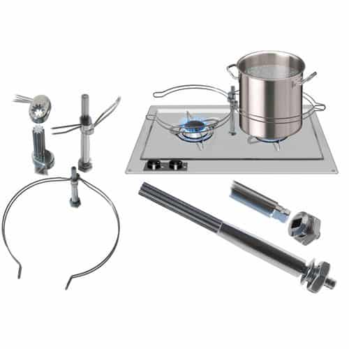 Fermapentole a colonna in acciaio inox adatto per la maggior parte dei piani di cottura e fornelli a gas, fornito con base forata e portagomma per eventuale scarico trabocco.