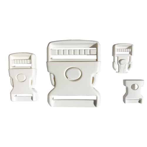 Fibbia ad innesto in resina acetalica con sicurezza, per l’apertura prevede un’azione manuale non praticabile dai bambini.