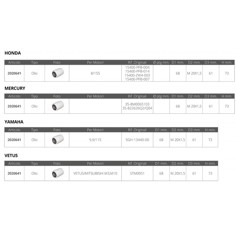 Filtro olio dim.Ø est.mm.68 Ø guarnizione mm. 61 altezza mm.73 passo M 20 X 1,5