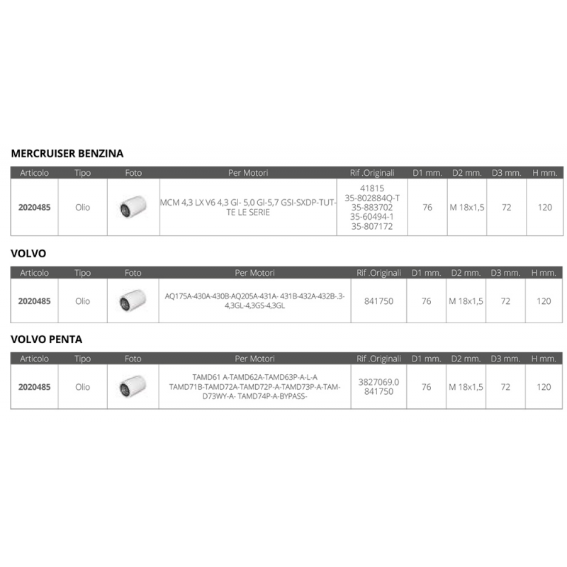 | Tipo | FILTRO OLIO MERCRUISER VOLVO |