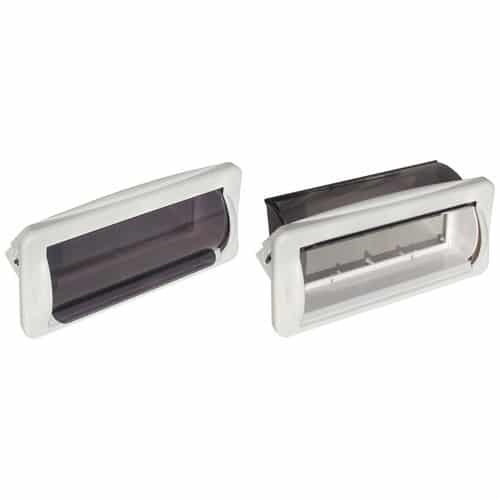 Frontalino di protezione radio in ABS bianco resistente ai raggi U.V. Sportello in plexiglass fumè con apertura a molla.