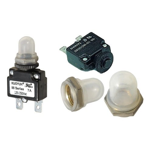 Fusibile automatico ad interruttore, con protezione termica con appuccio di protezione. Scatta immediatamente in caso di corto circuito e si reinserisce manualmente solo dopo aver eliminato la causa.