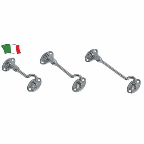 Gancio fermaporta in ottone cromato con doppio snodo, completo di piastrina.