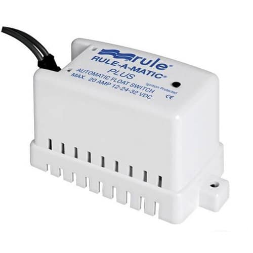 Interruttore automatico galleggiante “Rule” con meccanismo completamente sigillato e isolato dall’umidità e dagli urti. Un congegno manuale permette di verificare solo con un dito che il sistema funzioni correttamente.