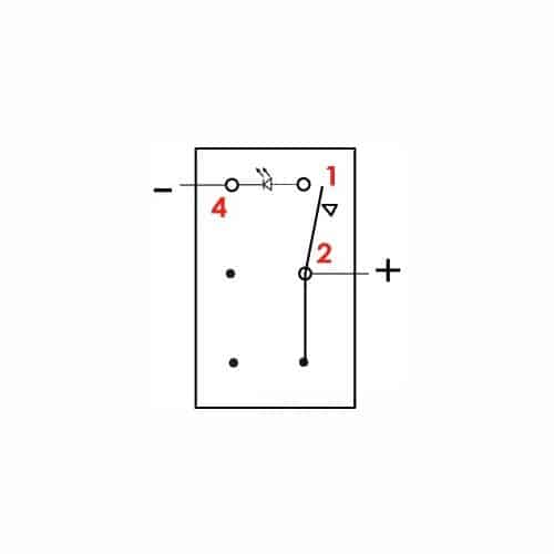 Interruttore a bascula Marina R impermeabilE IP56 con ritorno a molla. Richiede per l’installazione un foro rettangolare da 21,5×36,8 mm. Capacità max 25 A / 12 V. Bascula rigida e spia luminosa a LED che si illumina attraverso la bascula attivando il contatto.