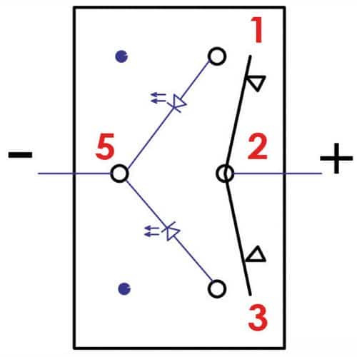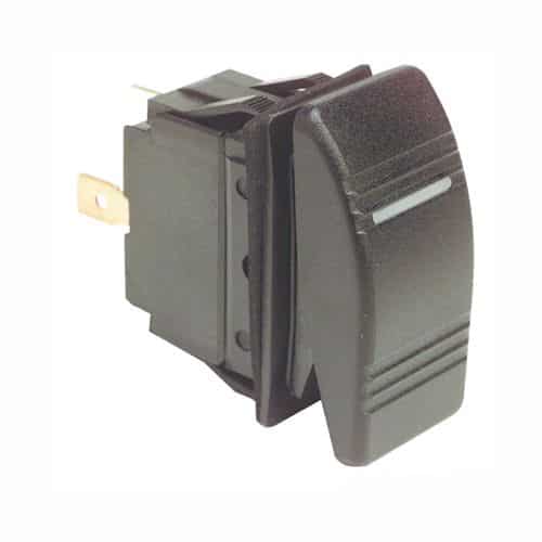 Interruttore a bascula Marina R impermeabili IP56 (ON)-OFF-(ON) per passerelle idrauliche, salpancore e flap. Richiede per l’installazione un foro rettangolare da 21,5×36,8 mm. Capacità max 25 A / 12 V. Bascula rigida e spia luminosa a LED che si illumina attraverso la bascula attivando il contatto.