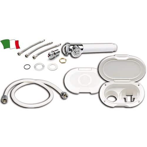 Kit doccia colore bianco completo di miscelatore, doccetta a stilo e tubo da 5 mt. Funzione: acqua calda e fredda.