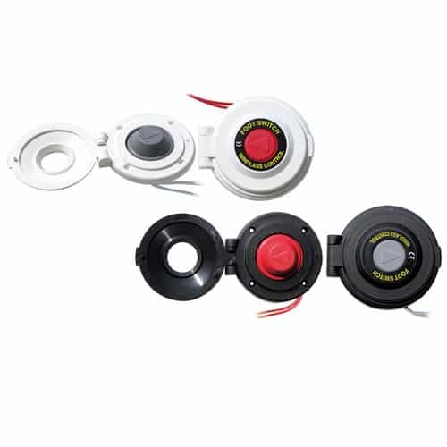 Pulsante a piede per l’azionamento del salpa ancora, fornito con coperchio di protezione per evitare la pressione accidentale.