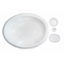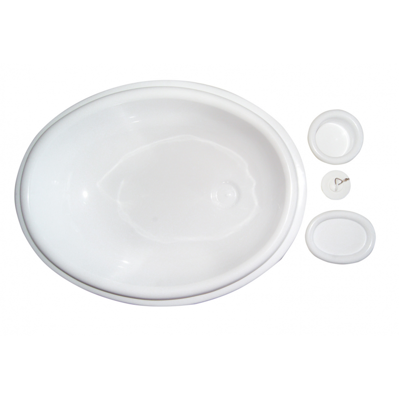Lavello ovale in PVC bianco per bagno completi di scarico con piletta (art. 2424030). Altezza totale mm 80, esterno mm 465×365, taglio mm. 300×400, Profondità incasso mm 60