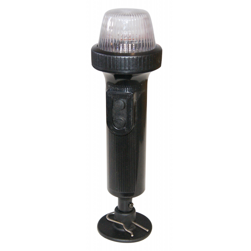 Luce di viain plastica, portatile e resistente all’acqua. Ideale per gommoni o barche fino a mt.7, base svitabile. Funziona con pile intercambiabili a torcia di tipo D (articolo 3985004) non incluse. Lampadina tipo E10.