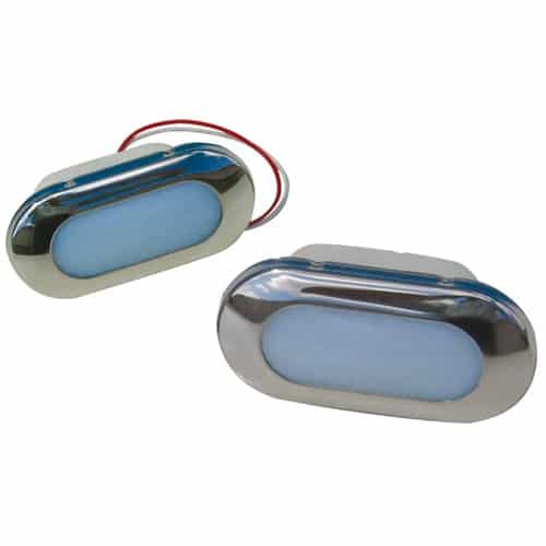 Luci di cortesia ovali a 4 led. Corpo fabbricato in ACCIAIO INOX e vetro esterno in plastica. Resistenti all’acqua.