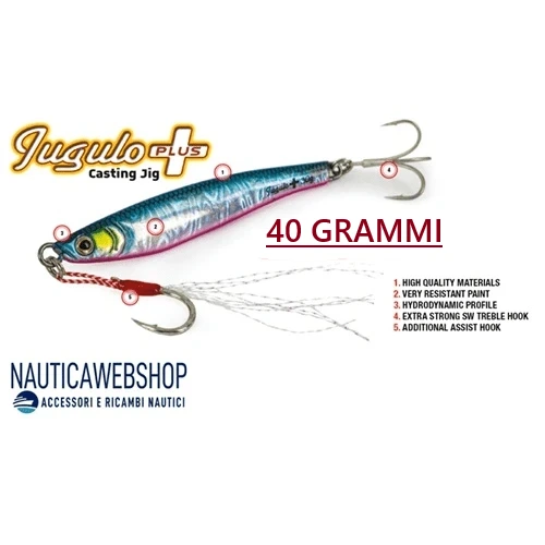 Esca artificiale Molix Jugulo Plus Casting Jig da 40 grammi costruito con materiali e vernici di elevate qualità e molto resistenti alle sollecitazioni cui sono sottoposti gli artificiali dedicati agli impieghi in acqua salata. Il corpo aerodinamico ha una disposizione del peso decentrata che gli dona un movimento molto simile al comportamento di un pesce foraggio, in mezzo al suo branco.
