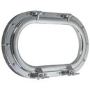Oblò modello ovale in ottone cromato, a tenuta stagna, chiusura a galletti, con ghiera posteriore.