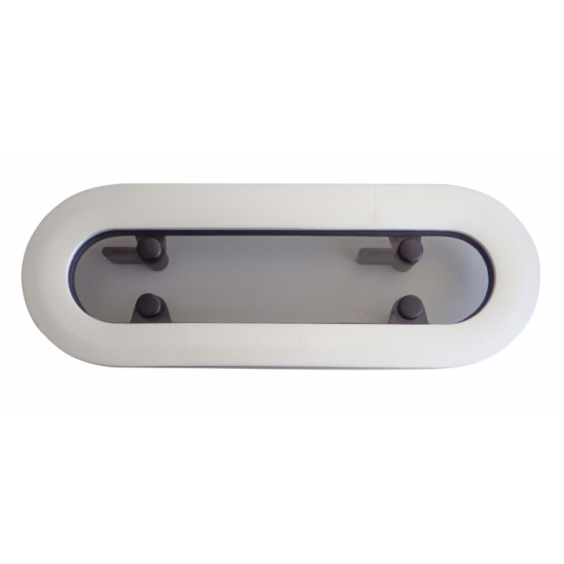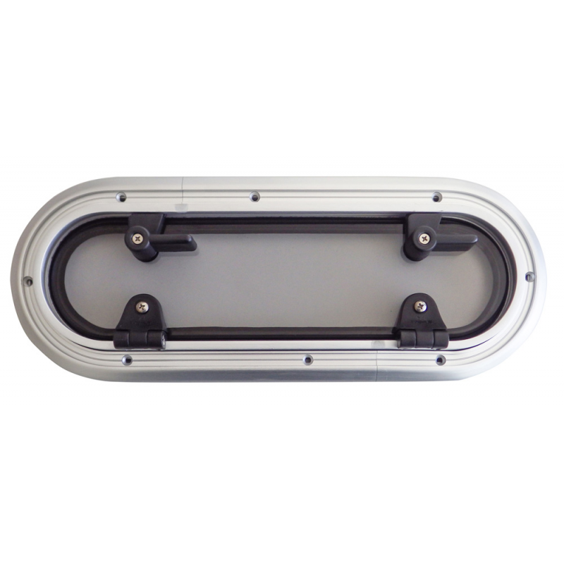 Oblò semiellittico apribile in lega leggera anodizzata, con cerniera a frizione per bloccare l’apertura nella posizione desiderata.Metacrilato da mm. 10.